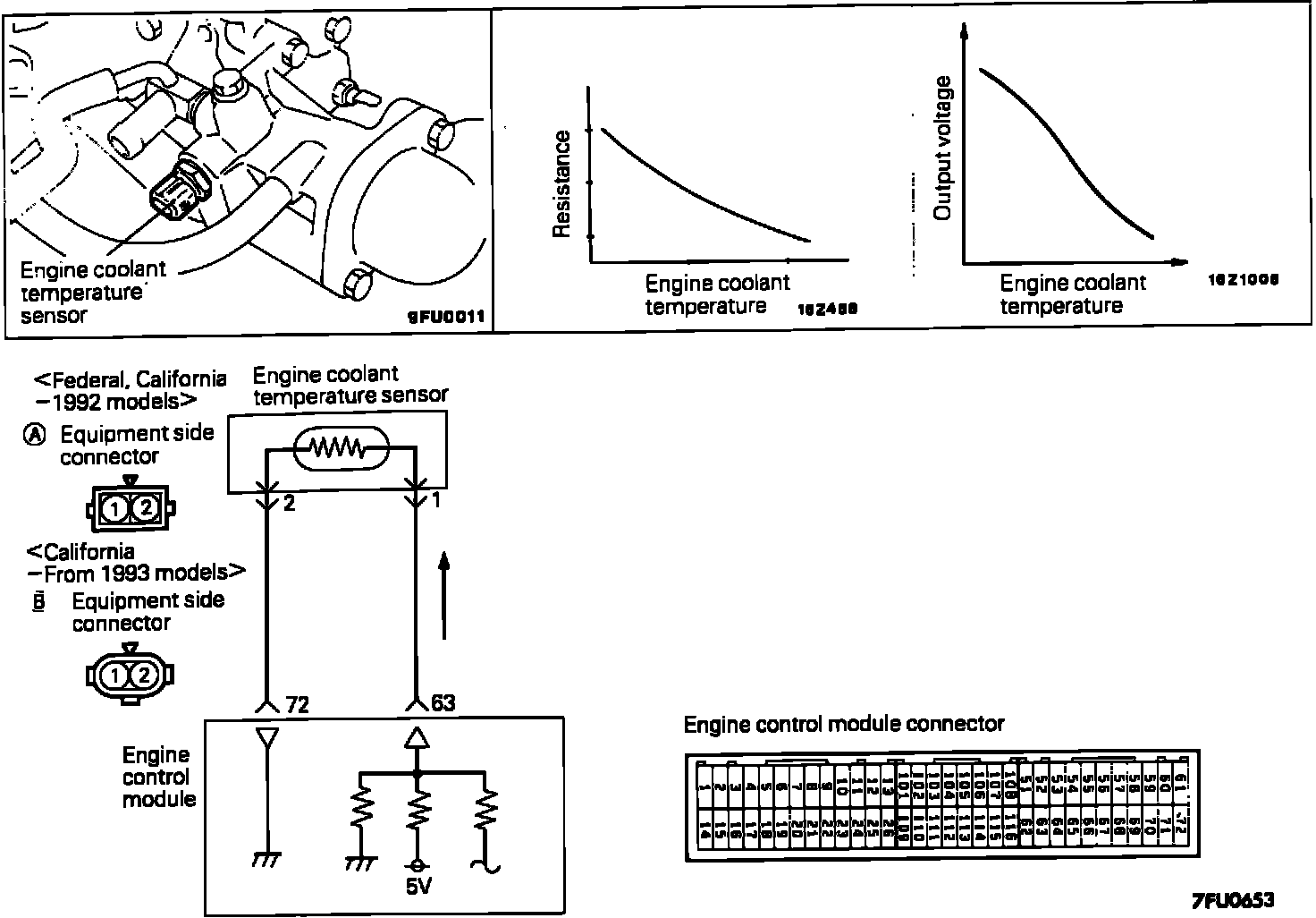 As engine temperature increases, sensor resistance decreases. The ECU monitors engine temperature by the sensor output voltage and provides optimum fuel enrichment when the engine is cold.