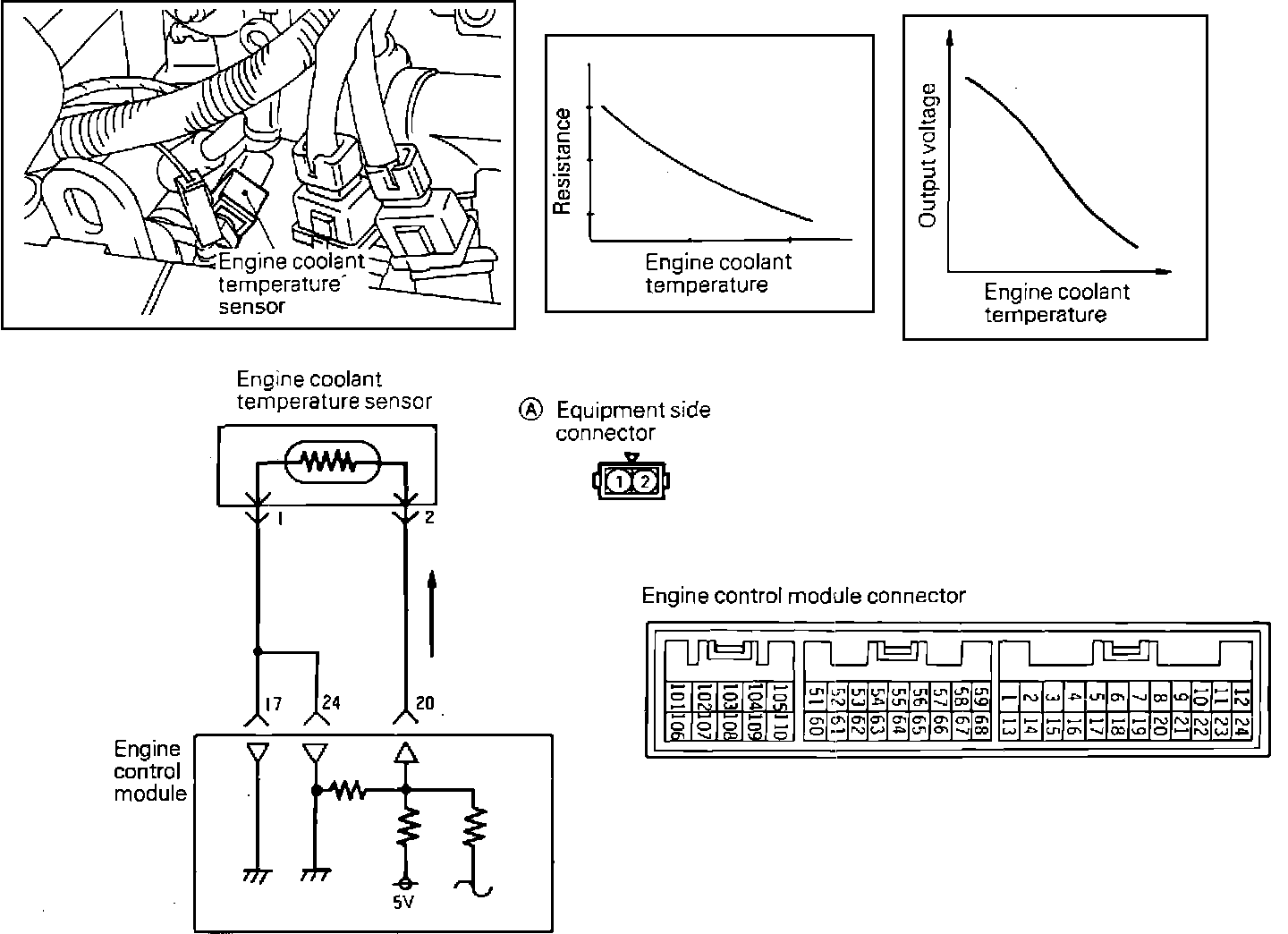 As engine temperature increases, sensor resistance decreases. The ECU monitors engine temperature by the sensor output voltage and provides optimum fuel enrichment when the engine is cold.
