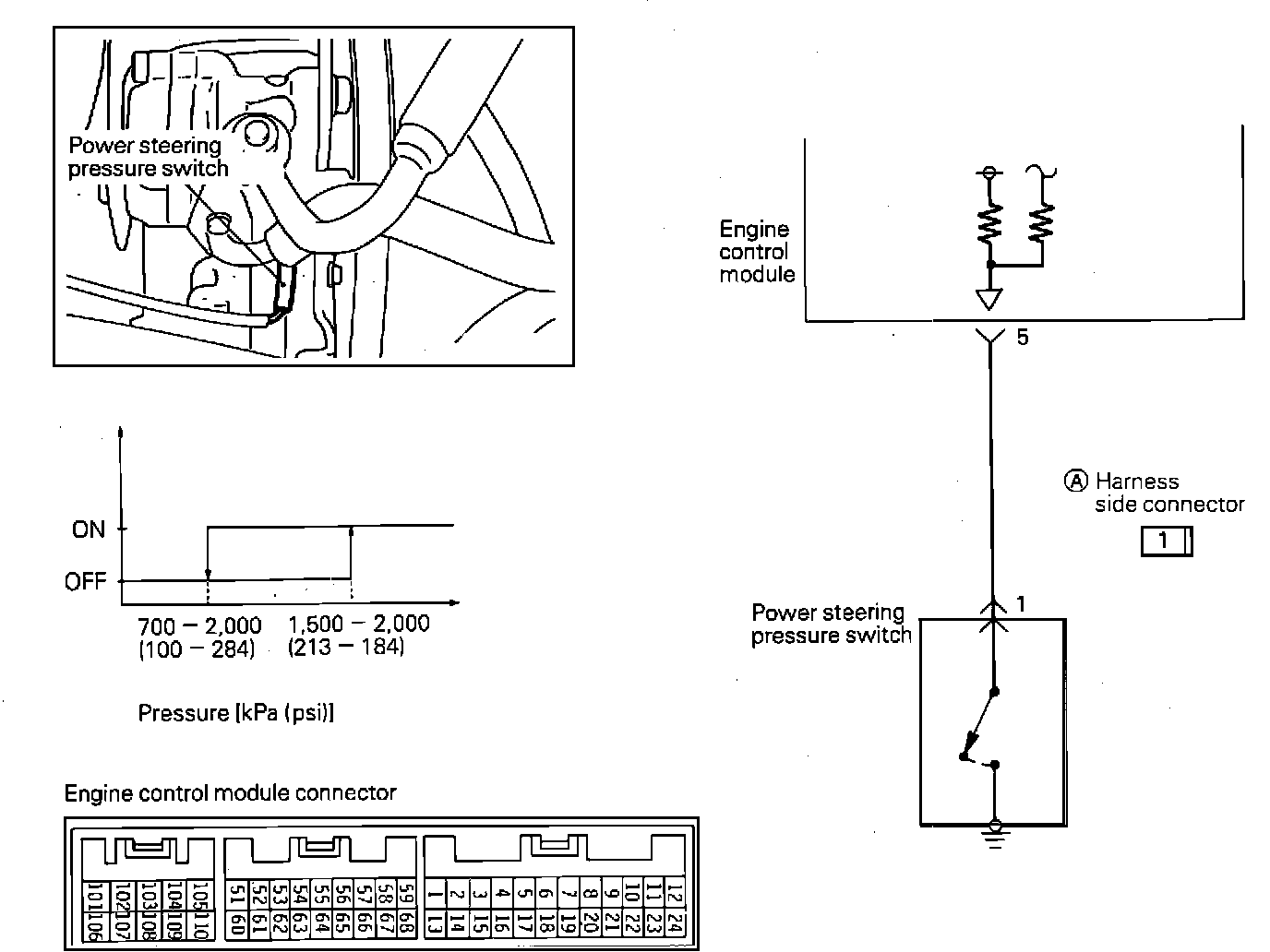 The Power Steering load switch provides a signal to the ECU when there is steering load. The ECU uses this information for idle speed control. When pump output pressure exceeds a preset level, the switch closes, completing the circuit to ground.