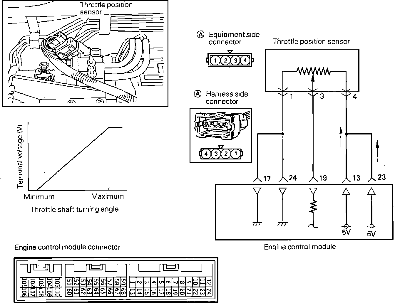 The Throttle Position Sensor (TPS) is a rotating type variable resistor. It senses the throttle valve angle.