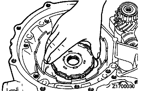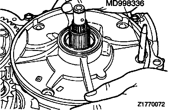 58. Place the spacer for the transfer shaft which was selected in step 57 in the transfer shaft bearing hole in the converter housing, and insert the bearing outer race in the case.