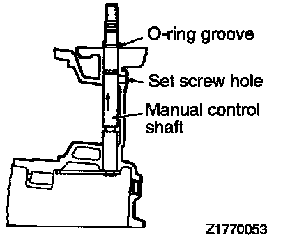 63. Install the parking sprag rod to the manual control shaft. Then, insert the shaft in the transaxle as shown in the illustration. In doing this work, do not install O-ring in the O-ring groove.
