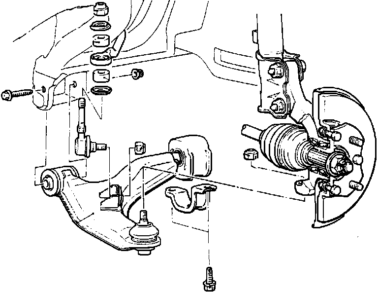 4. Loosen lower control arm to chassis attaching bolts, then remove lower control arm.