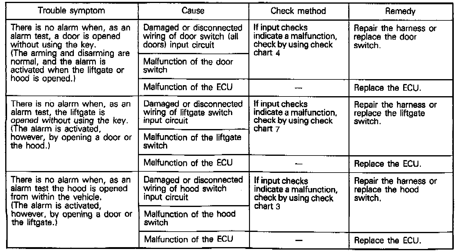 1. If the liftgate unlock switch or door key cylinder unlock switch is operated roughly, or if these switches have been installed incorrectly or switches themselves are defective the ECU may not accept the warning or alarm canceling signal. In such case, the alarm operation will take place when the door is opened using a key. (When the door key cylinder switch has been shorted, however, if the ignition switch is turned ON, the ECU judges the detection switch as faulty and thereafter, it will prevent setting of (warning) alarm until the shorting is corrected.]