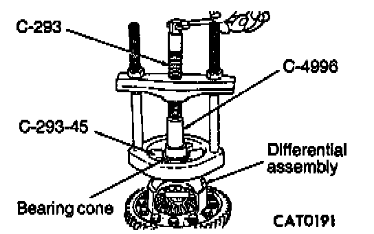 10. Remove differential bearing from differential case side using Puller C-293, four Adapter Blocks C-293-45 and Adapter C-4996.
