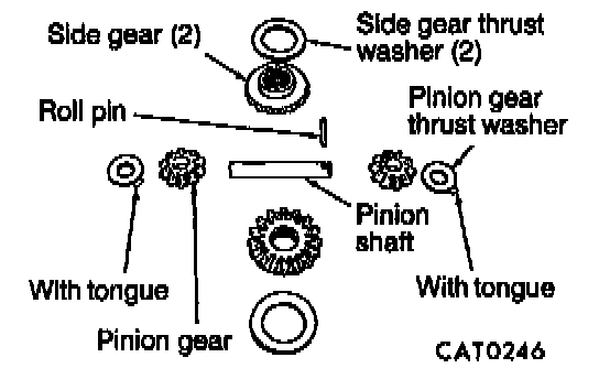 15. Remove pinion gears, side gears and tabbed thrust washers by rotating pinion gears to opening in differential case.