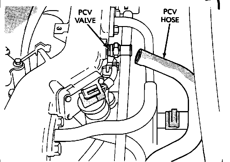 1. With engine idling, remove hose from PCV valve. If valve is not plugged, a hissing sound will be heard as air passes through the valve, and a strong vacuum should be felt when a finger is placed over the inlet of the valve.