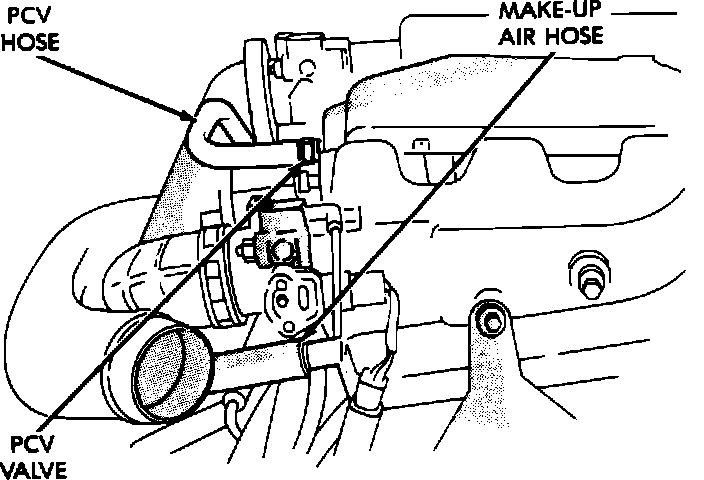 2. Reinstall the PCV valve hose, then remove the make up air hose. With engine idling, loosely hold a piece of stiff paper (such as a parts tag) over the opening in the hose. After allowing about a minute for the crankcase pressure to reduce, the paper should be drawn against the opening in the rocker arm cover.