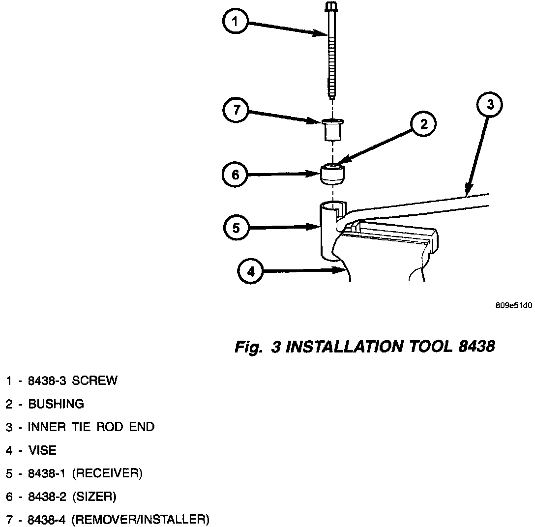 The inner tie rod bushings have previously been serviced with the tie rod assembly. This bulletin releases the parts, service procedures, and special tool necessary to service just the bushings. Subsequent service manuals will contain the Repair Procedure.