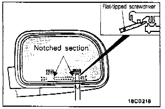 Turn the mirror by hand so that it faces upwards. insert the flat-tipped screwdriver wound with masking tape into the notched section, and lever out the mirror to remove it.