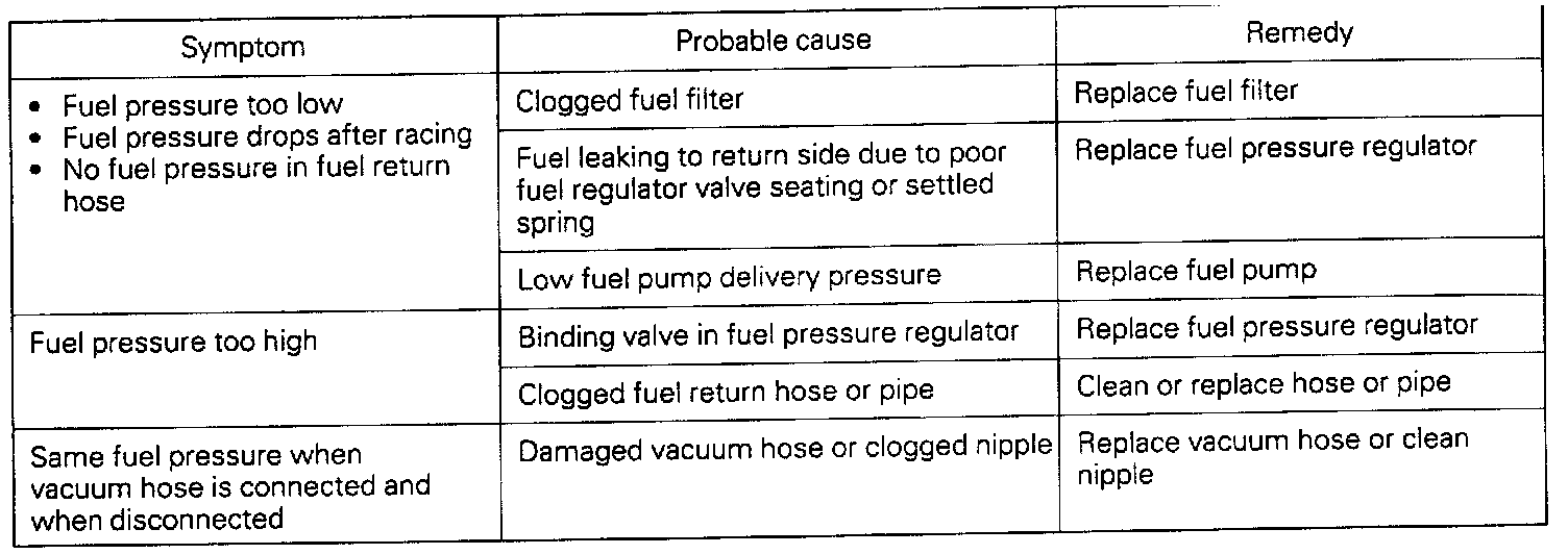 13. If any of fuel pressure measured in steps (8) to (11) is out of specification, troubleshoot and repair according to the table below.