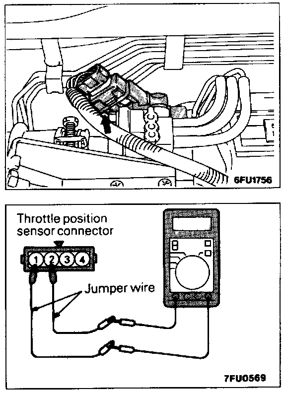6 Slowly turn the throttle position sensor in the counter clockwise direction until the point at which continuity between terminals G1 and Q2 changes to non-continuity is found. Tighten the throttle position sensor installation bolt at that position.