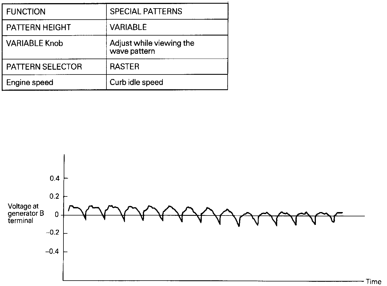 Furthermore, the voltage waveform of the generator B terminal can undulate as shown at left. This waveform is produced when the regulator operates according to fluctuations in the generator load (current), and is normal for the generator.