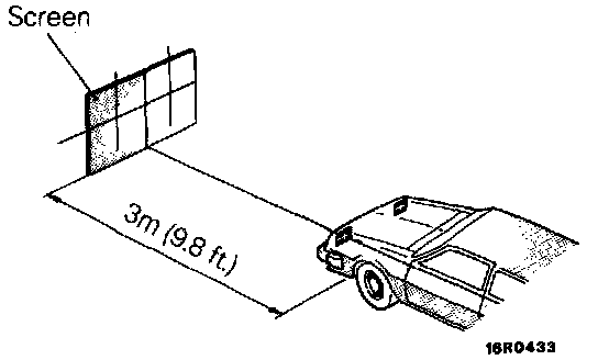 2. Place vehicle on a known level floor 3m (9.8 feet) from aiming screen or light colored wall. Four lines of adhesive tape or like are required on screen or wall: