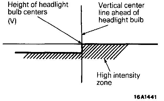 1. A properly aimed lower beam will appear on the aiming screen 3m (9.8 feet) in front of the vehicle. The shaded area as shown in the illustration indicates high intensity zone.