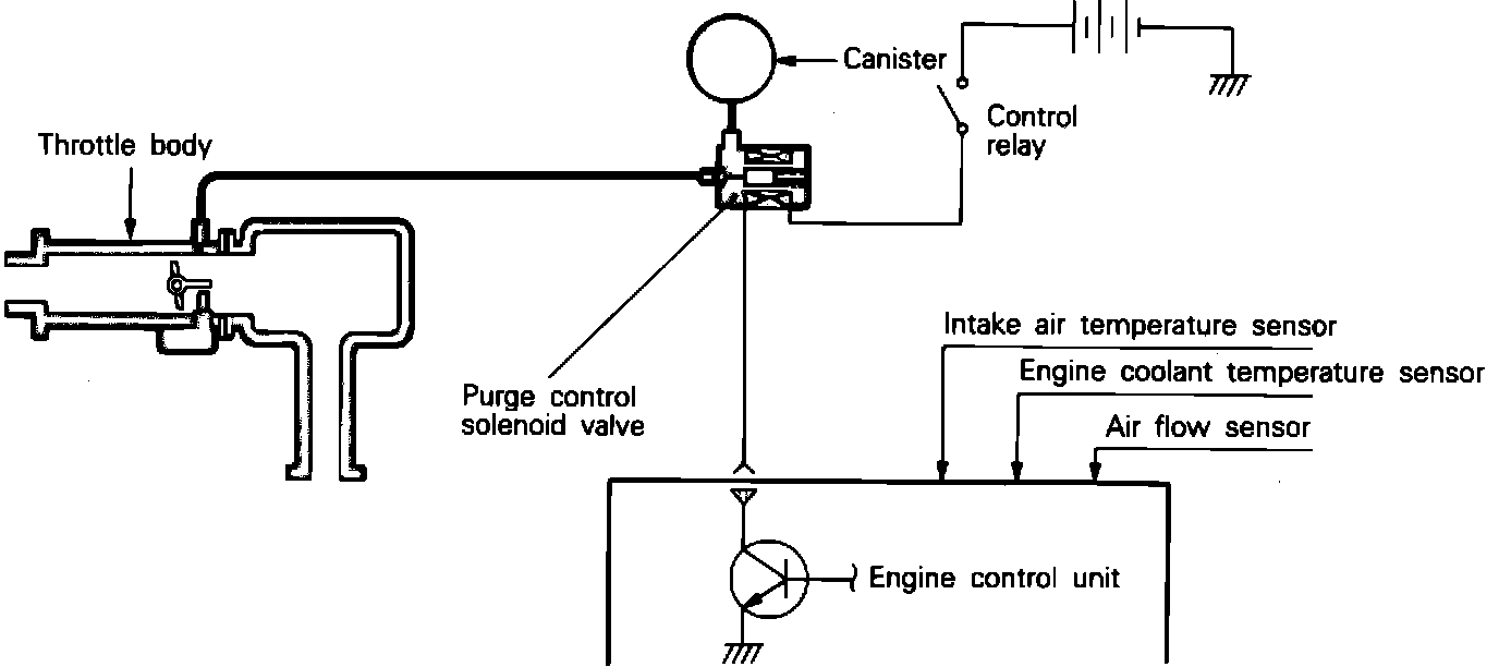 When the ECM senses the correct conditions for operation, it supplies the ground circuit to the solenoid. This opens the solenoid, allowing manifold vacuum to be applied to the carbon canister, allowing fresh air is to be drawn into the bottom of the canister.