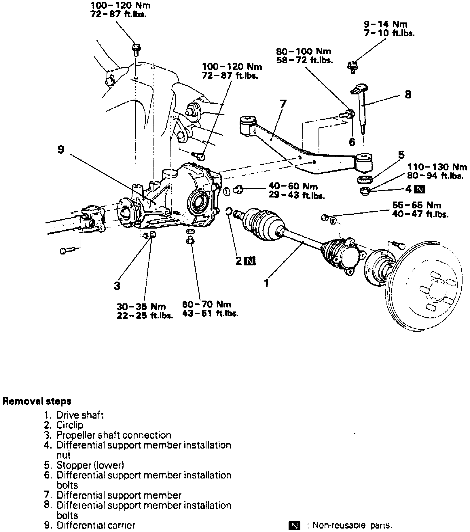 5. Remove differential to propeller shaft connection, then support propeller shaft with wire.