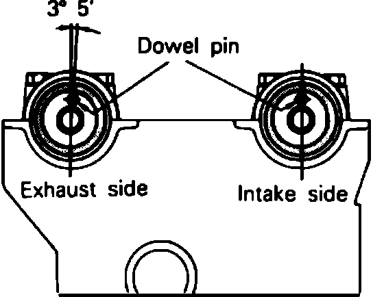 1. Install the camshafts on the cylinder head. Ensure intake side camshaft is installed on intake side and exhaust side camshaft is installed on exhaust side. Intake side camshaft has a slot machined in the back end to drive the crank angle sensor. Once installed, the camshaft dowel pins should be in the positions as shown in Fig. 68.