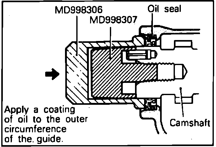 3. When installing camshaft oil seal, use oil seal guide tool No. MD998307 and oil seal installation tool No. MD998306 or equivalents as shown, Fig. 69.