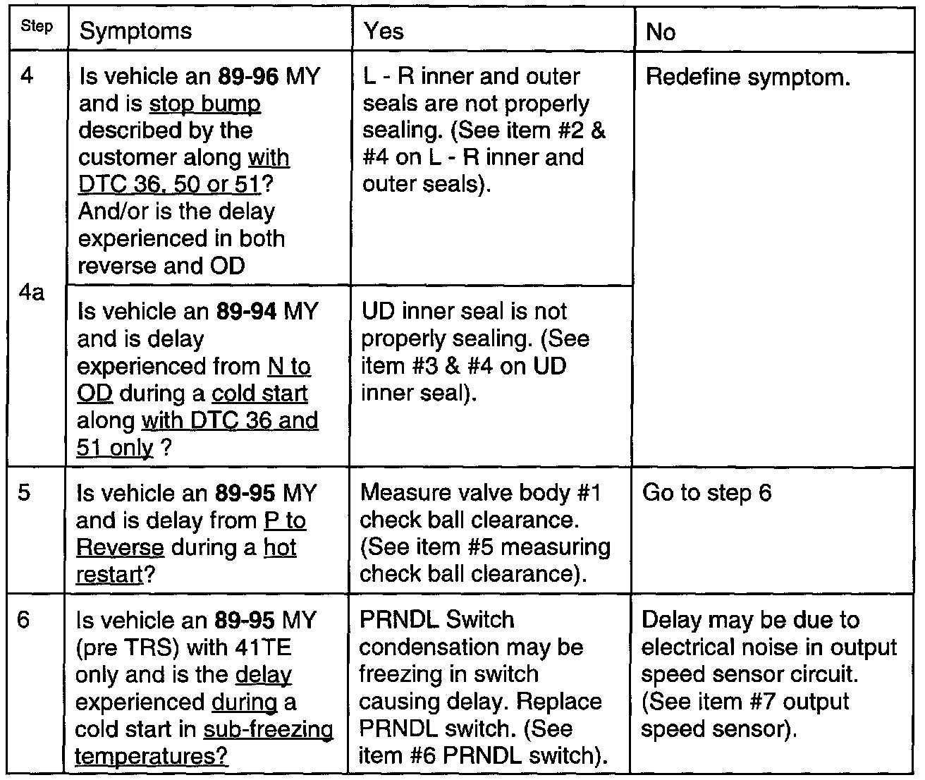 Intermittent delayed transaxle engagement greater than three seconds. The transaxle may be cold or hot based on the table as shown.