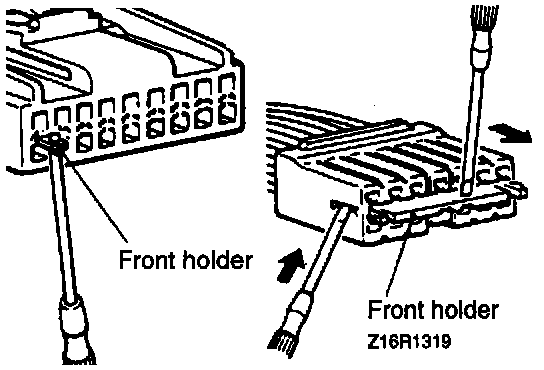 1. Insert screwdriver [1.4 mm (0.06 in.) width] as shown in the figure, disengage front holder and remove it.