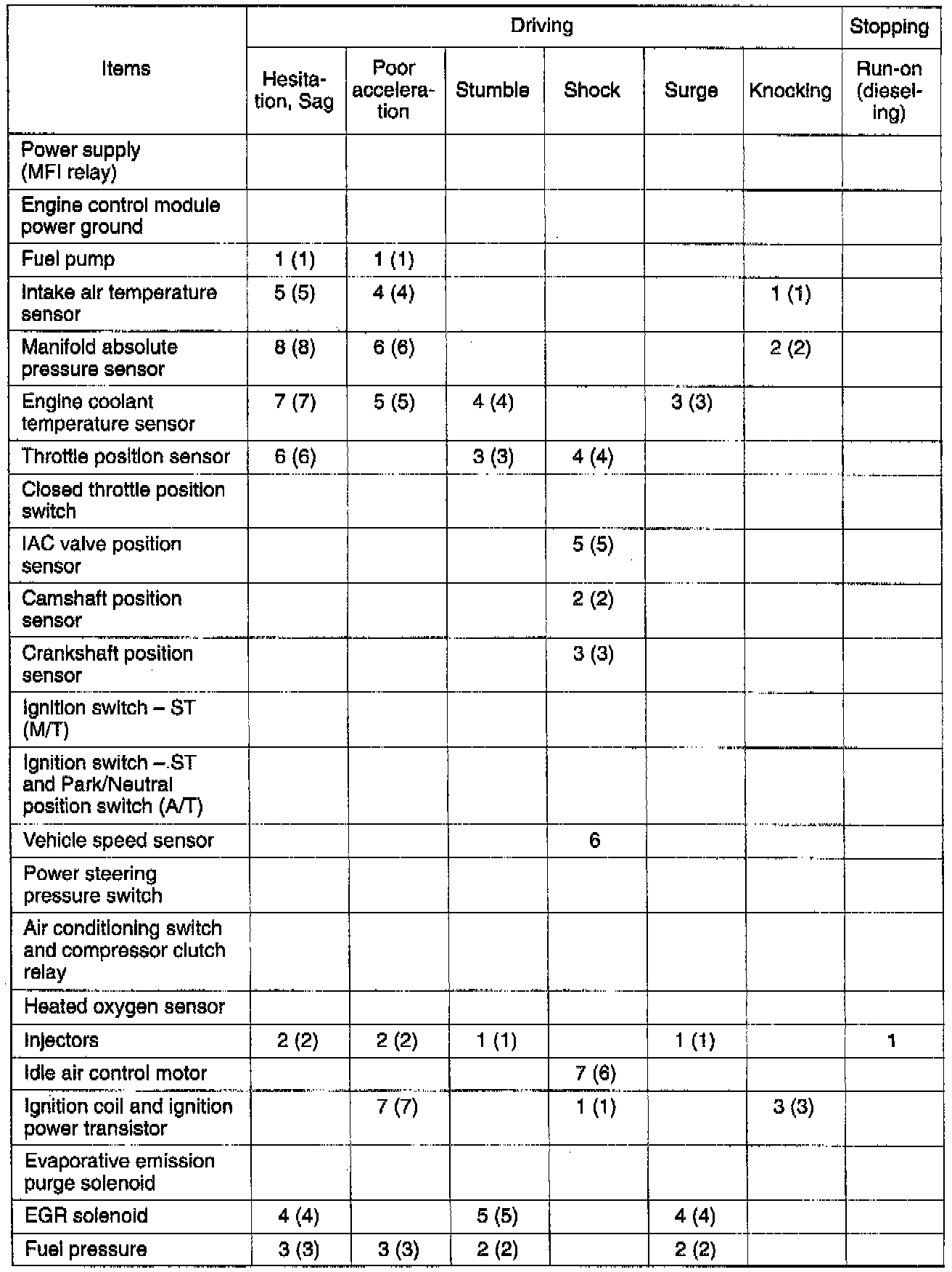 The numbers in the table indicate the check order. Numbers within brackets () indicate cold engine, without brackets indicates a warm engine.