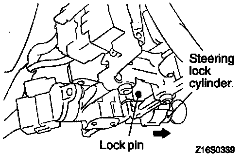 2. Using a Cross-tip (+) screwdriver (small) or a similar tool, push the lock pin of the steering lock cylinder inward and then pull the steering lock cylinder toward you.