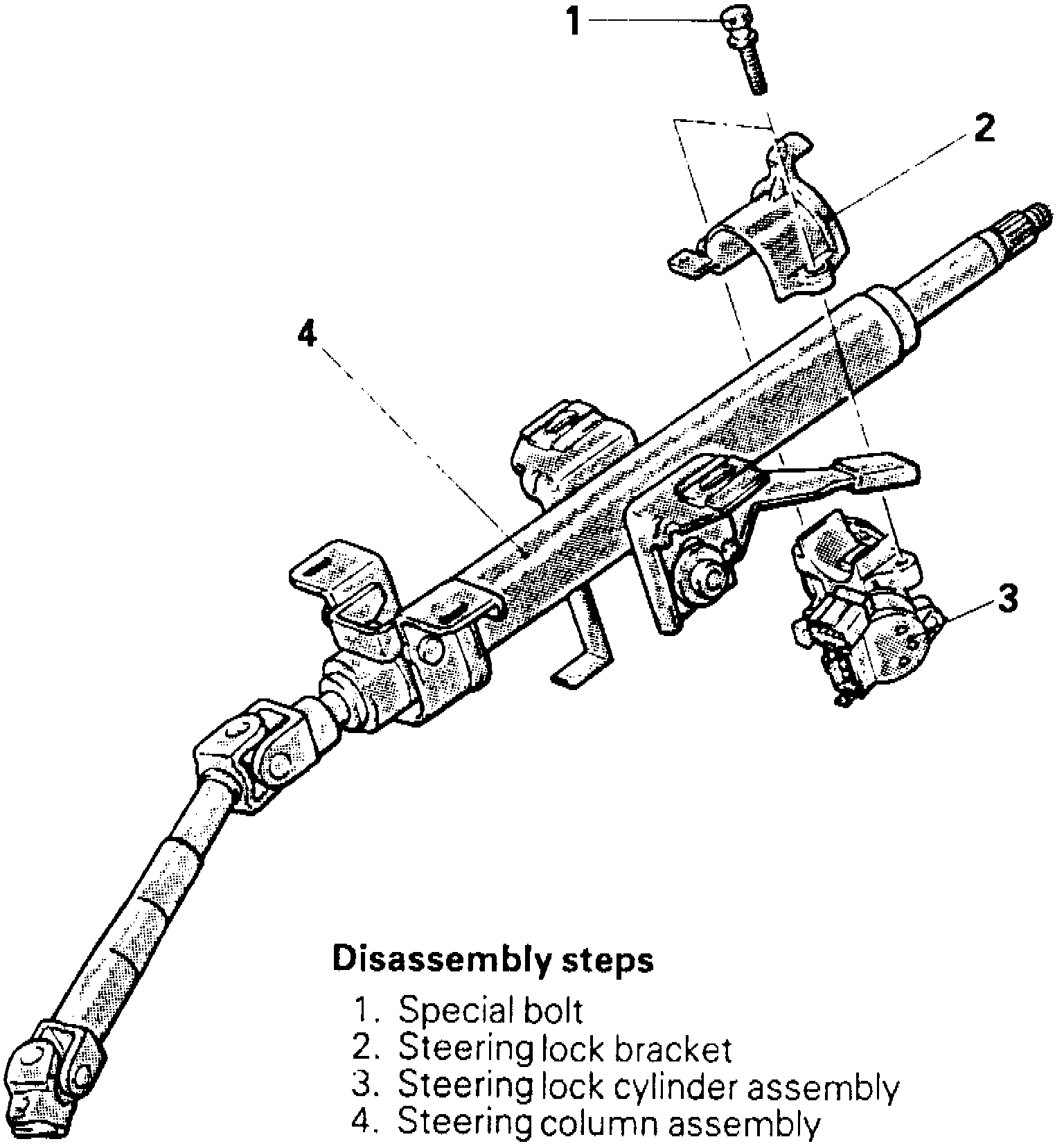 1. If steering lock cylinder is to be removed, cut special bolts at bracket side with a hacksaw.