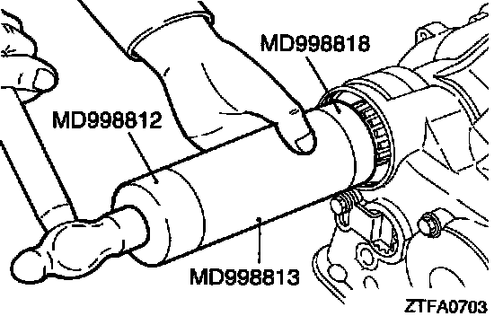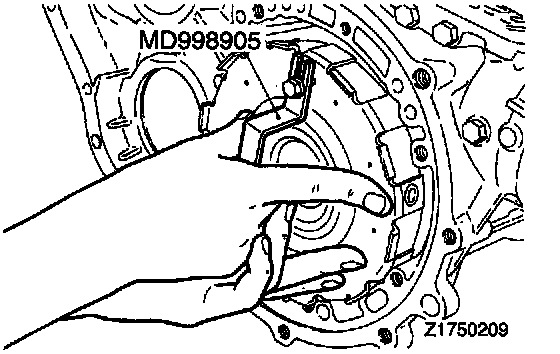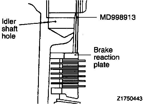Make sure that the dial indicator rod (MD998913) is inserted into the transfer idler shaft hole, contacting the brake reaction plate at a right angle.