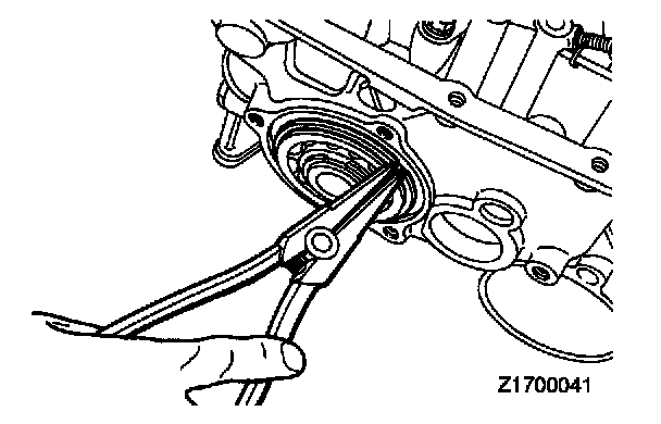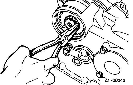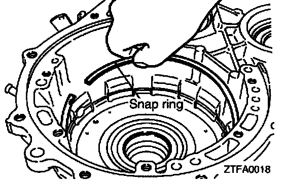 16. Install the tapered roller bearing outer race, and then the snap ring.