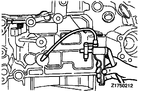i. Using a hand pump, feed air through the location shown and, at the same time, read the dial indicator and select a pressure plate to obtain the specified end play.