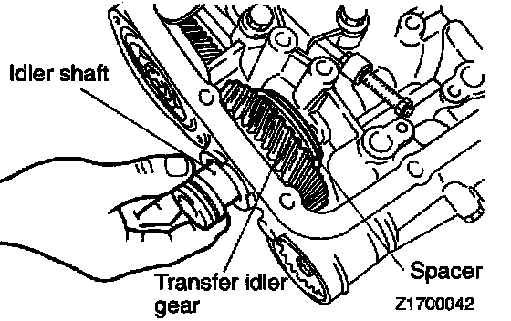 8. Place the transfer idler gear in the case, and insert and screw the idler shaft into position.