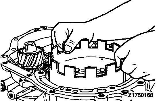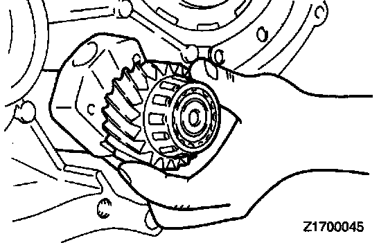 3. Insert the output flange in position (with two ball bearings and transfer drive gear attached) from the inside of the transaxle case.