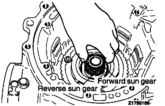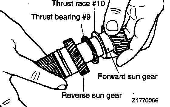 22. Attach thrust race # 10 and thrust bearing # 9 to the forward sun gear. Then, assemble the reverse sun gear.