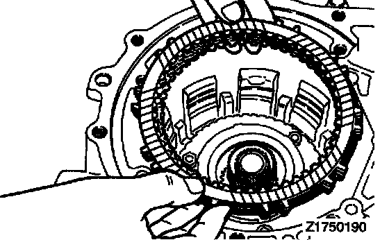 CAUTION: Blow off automatic transmission fluid from the plates and discs with low-pressure compressed air.