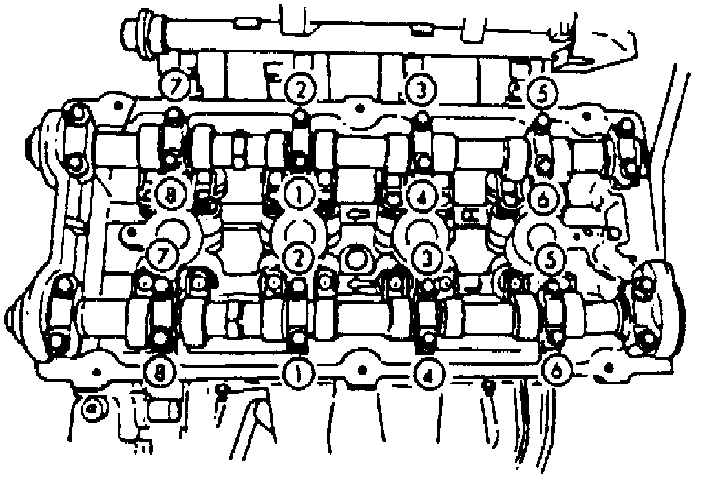 3. Loosen camshaft bearing cap attaching bolts in sequence shown in Fig.69, one camshaft at a time.