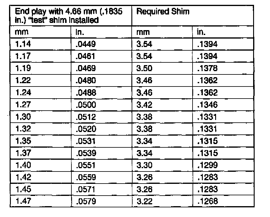 For example, if end play reading is 1.40 mm (0.0551 inch), subtract end play specifications. 1.40 mm (0.0551 inch)- [0.13 mm (0.0051 inch) to 0.64 mm (0.0252 inch)] = 1.27 mm to 0.76 mm (0.0500 inch to 0.0299 inch). Add "test" shim. 0.76mm to 1.27 mm (0.0299 inch to 0.0500 inch) +0.81 mm (0.0319 inch) = 1.75 mm to 2.08 mm (0.0618 inch to 0.0819 inch). Select shim closest to mid point or 1.69 mm to 1.91 mm (0.0665 inch to 0.0752 inch).