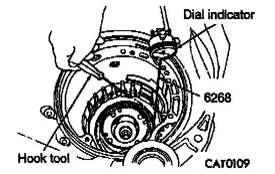 65. Check clutch clearance. Set up Dial Indicator set using Dial Indicator Tip 6268 as shown. Press down on the clutch pack with finger and zero dial indicator. Raise one clutch disc with a hook tool. Read the dial indicator.
