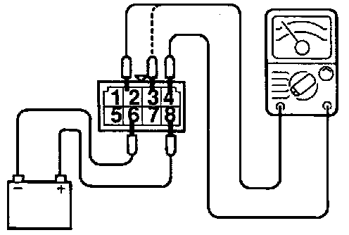 6. Check the continuity between MFI relay terminals 2 - 4 and terminals 3 - 4 while connecting and disconnecting the jumper lead at the battery (-) terminal.