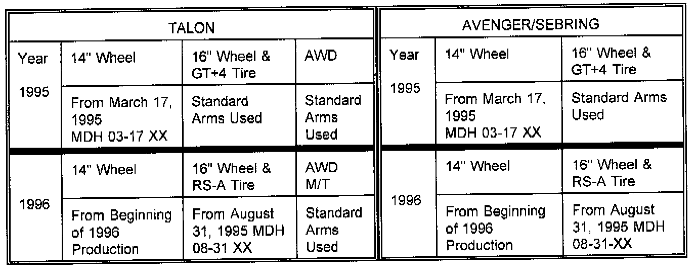 Offset compression arms were introduced into production. The dates and applications in which the new arms were put into manufacture are shown in the chart.