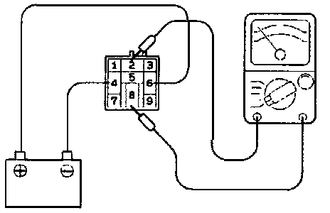 3. Use jumper leads to connect relay terminal No. 6 to the battery (+) terminal and terminal No. 4 to the battery (-) terminal. Check the continuity between relay terminal Nos. 2 - 8 while connecting and disconnecting the jumper lead at the battery (-) terminal.