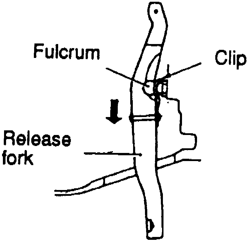 4. Slide release fork in direction of arrow as shown, and disengage fulcrum from clip to release fork.