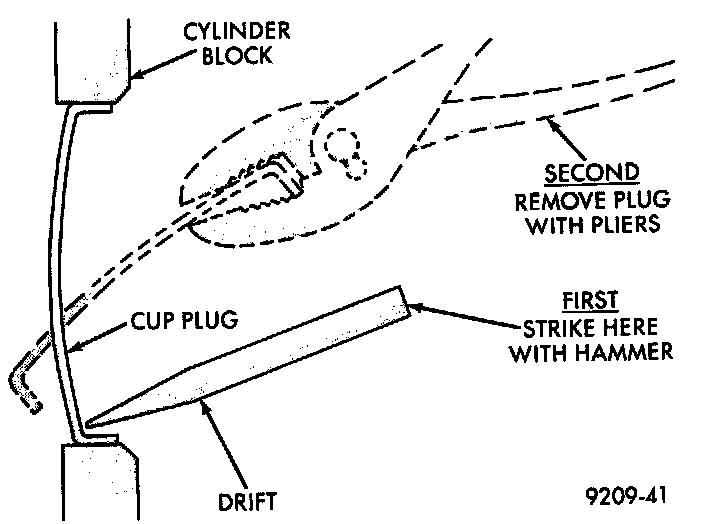 Using a blunt tool such as a drift and a hammer, strike the bottom edge of the cup plug. With the cup plug rotated, grasp firmly with pliers or other suitable tool and remove plug.