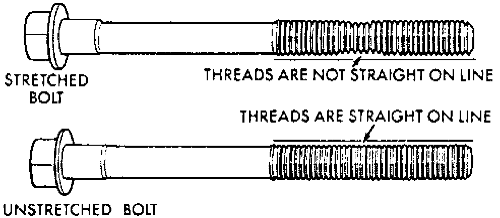 12. Check cylinder head bolts for necking by holding a scale or straightedge against threads. If all threads do not contact the scale, bolts should be replaced.