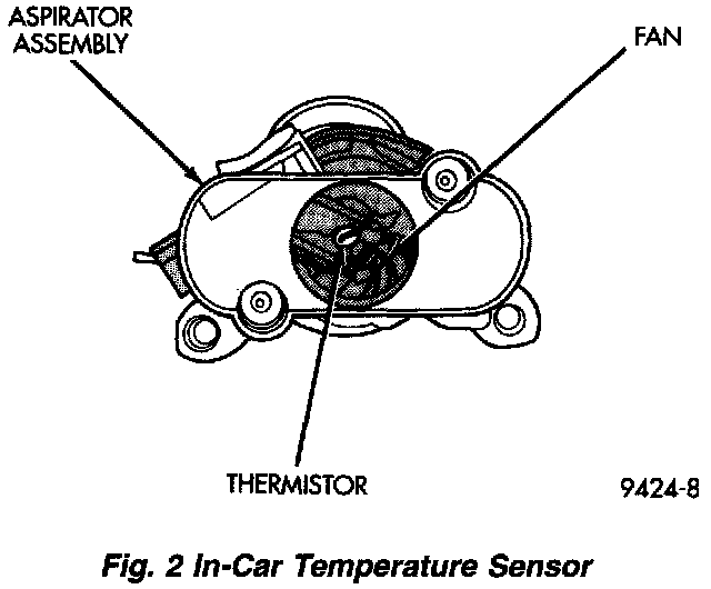 The In-Car Sensor will automatically turn on when a vehicle door is opened. If the door is left open, the In-Car Sensor will automatically turn off within approximately 5 minutes. If the door is then closed, but there is no ignition start, the In-Car Sensor will automatically turn off after approximately 2 minutes. After the vehicle has been driven, the In-Car Sensor will turn off immediately when the ignition is turned off. The aspirator motor in the In-Car Sensor operates whenever the ignition switch is on (even when the ATC system off button is pushed). If the In-Car Sensor is open or shorted on this system, the digital display will turn off. Then the system defaults to manual operation.