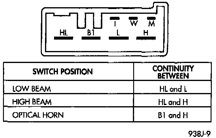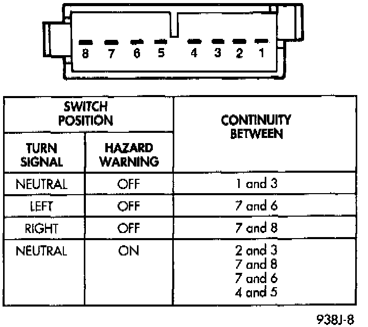 To test the switch, first disconnect the battery negative cable, then remove the upper and lower column covers to gain access to the switch connector. Remove switch from the column and remove the switch connector. Using an ohmmeter, test for continuity (no resistance) between the terminals of the switch as shown in the above continuity charts.
