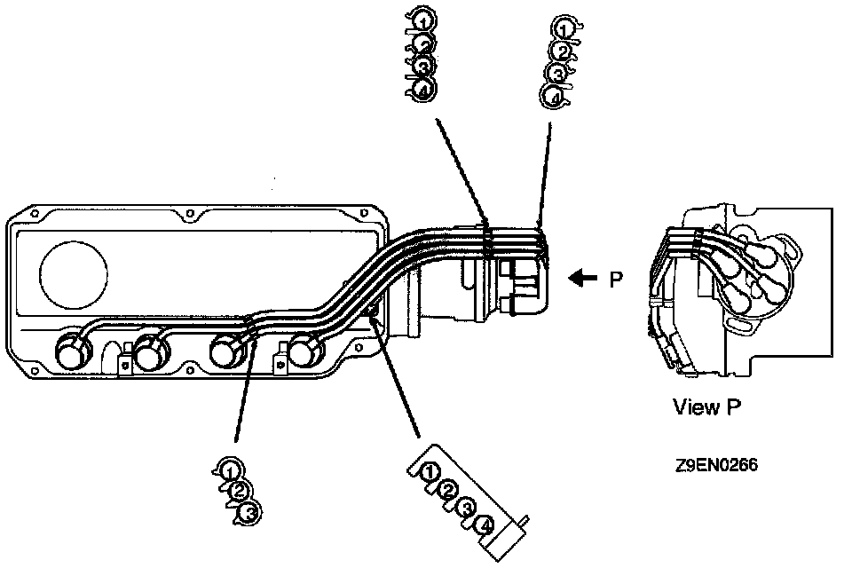 Improper arrangement of spark plug cables will induce voltage between the cables, causing miss firing and developing a surge at acceleration in high-speed operation. Therefore, be careful to arrange the spark plug cables properly by the following procedure.