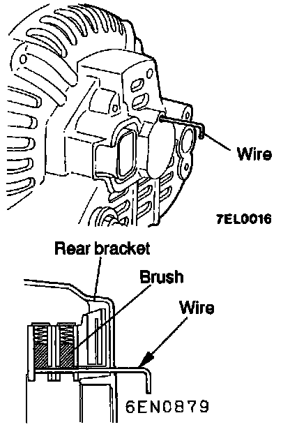 is attached to rear bracket, insert wire through small hole made in rear bracket to lift brush. After rotor has been installed, remove the wire.