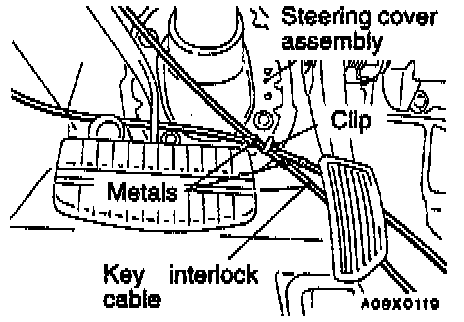 Secure the section between the metals of the shift lock cable and key interlock cable with the clip of the steering cover assembly.