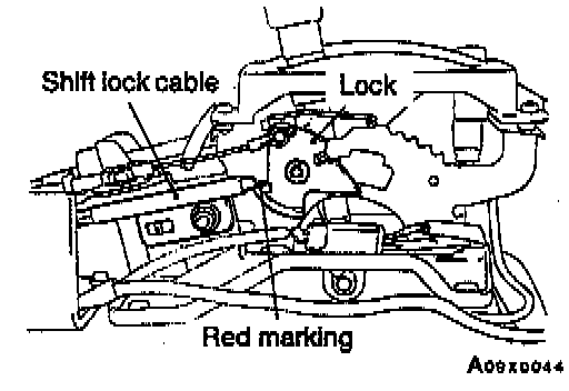 2. Fasten the shift lock cable at the position where the end of the shift lock cable is positioned above the red marking.